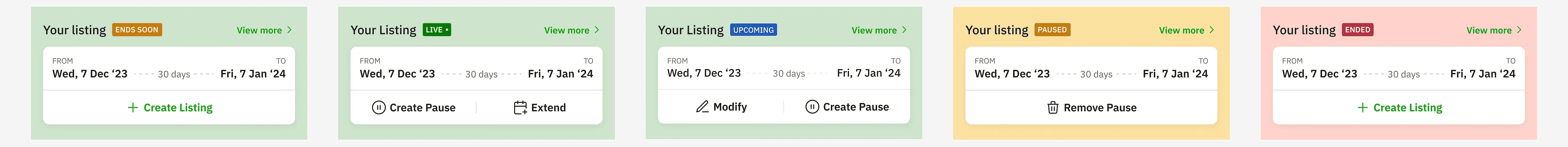The Your Listing section was designed so that each listing state displays dynamic controls, with an info/redirection box offering relevant guidance based on the current state.